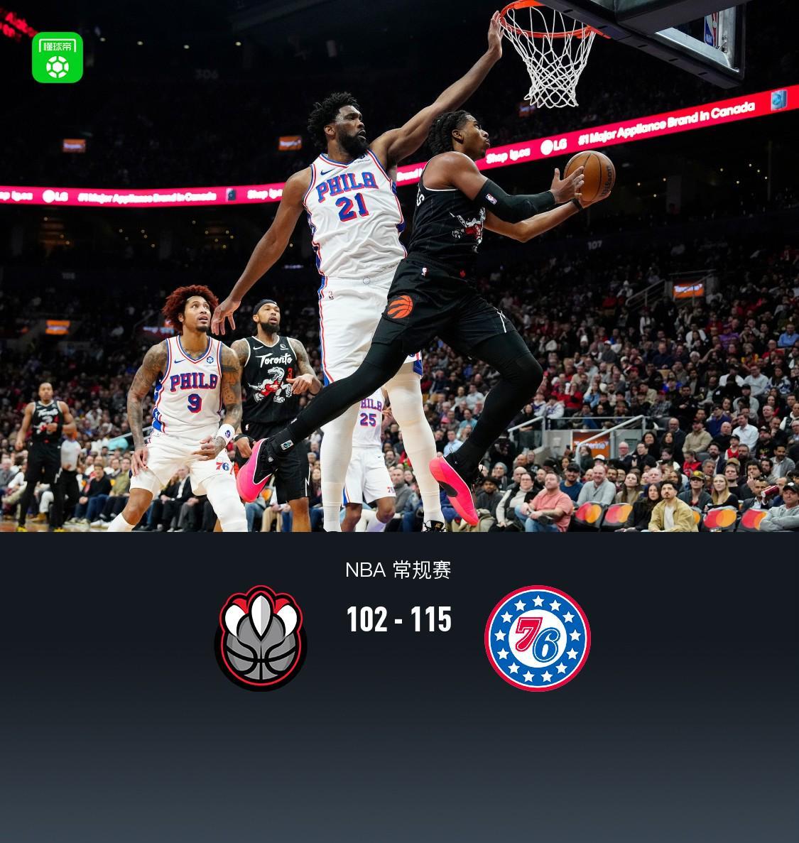 第四节猛龙斯科蒂-巴恩斯拿下5分,76人恩比德拿下8分,最终猛龙102-115不敌76人