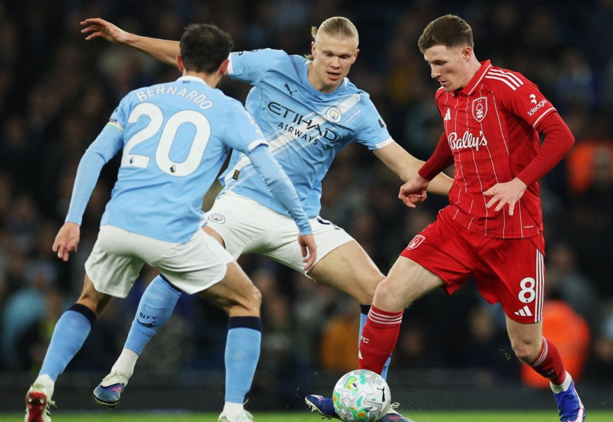 比赛开始后不久,塞门约在禁区左侧大力抽射,踢偏了。随后,伯纳多-席尔瓦的射门被门将扑住。第23分钟,福登尝试一脚远射,踢得太正了。门将把球拦下。3分钟后,吉布斯-怀特禁区左侧低射被门将倒地没收。第31分钟,谢尔基突入禁区后送出传中球,塞门约凌空射门打进。第42分钟,哈兰德小角度射门踢偏了。半场结束,曼城1-0领先诺丁汉森林。