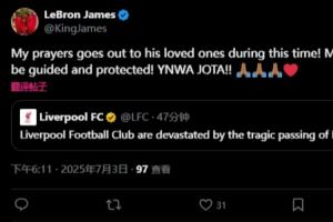 洛杉矶当地时间凌晨3:11分,湖人球星詹姆斯发推悼念若塔:“在这艰难时刻,我的心与他的家人们同在!愿你们都能得到指引和庇佑!你永不独行,若塔!(YNWA JOTA!)”