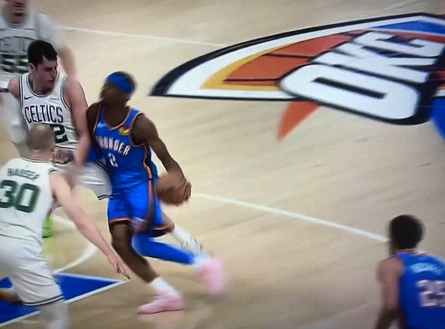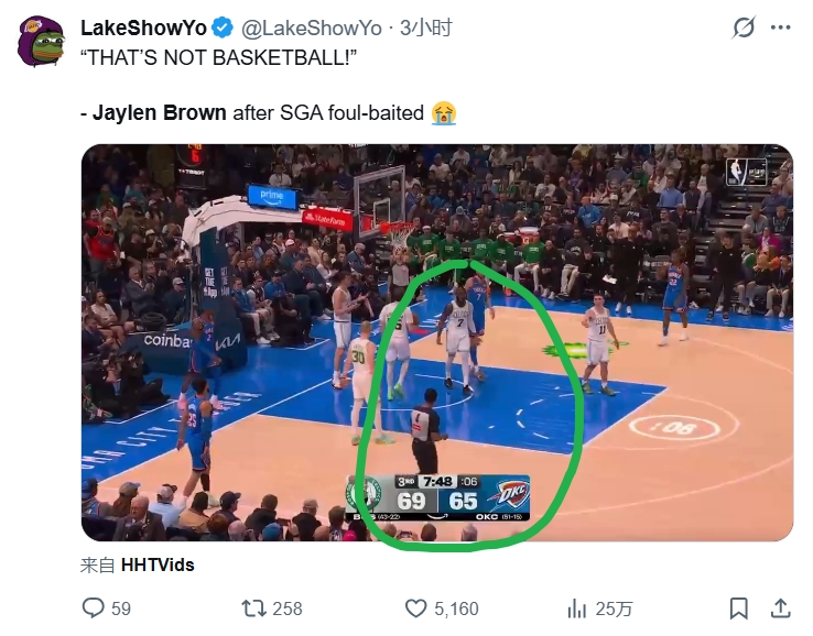 比赛中,SGA在一次挂手臂造成犯规后,杰伦·布朗对裁判表示:“这不是篮球。”