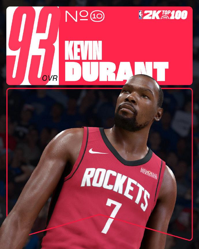 杜兰特的能力值虽然比詹姆斯和库里低了点,但也达到了93,和浓眉、米切尔、布伦森、哈利伯顿打成平手,刚好排在第十。今年夏天,杜兰特也被交易到了火箭,由此也成为火箭又一位能力值排在前十的球员,上一位还是2K21的哈登,以96的能力值排名联盟第三,仅次于詹姆斯(98)字母哥(97)。